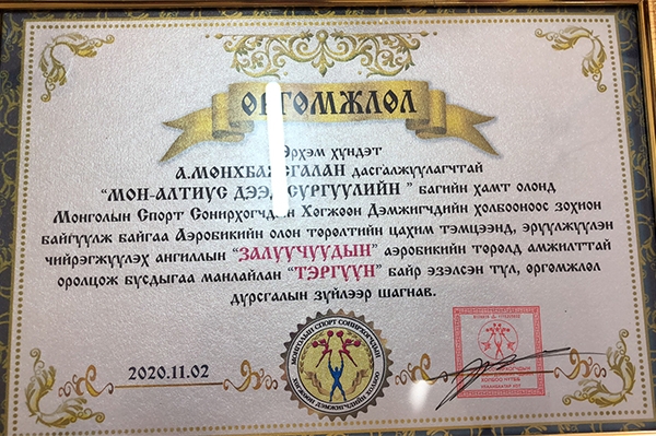 “Монголын Спорт Сонирхогчдын Хөгжөөн Дэмжигчдийн Холбоо”-ноос зохион байгуулсан Аэробикийн олон төрөлтийн Цахим тэмцээнд “Эрүүлжүүлэн чийрэгжүүлэх” ангиллын “ЗАЛУУЧУУДЫН аэробикийн төрөлд 1-р байр эзэлсэн А.Мөнхбаясгалан дасгалжуулагчтай Мон-Алтиус Дээд Сургуулийн баг тамирчиддаа баяр хүргье.